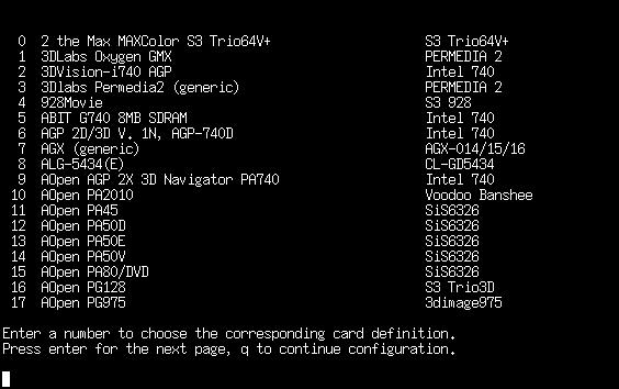 There are over 800 cards in the database. The left column contains a number for each card and the card's name. The right column contains the chipset for that card. Keep hitting enter until you find your video card in the list. When you've found your card, enter the number and hit enter. If you don't know what kind of video card you have, there are a few options. First, you could look at the “Chipset” line from SuperProbe and look for a card matching that chipset in the database. Or, you could use a generic SVGA card type. Many cards that do not have their own server are supported by the SVGA server, so this could be a safe choice.