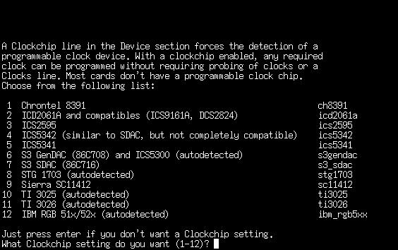 If your card has a programmable clockchip, you'll want to select one from this next listing. Keep in mind that most cards do not have a programmable clockchip, so you should be safe by just hitting enter. SuperProbe should report if your card has a clockchip.