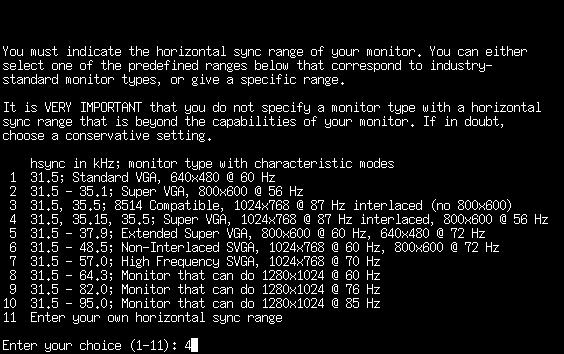 Having your monitor's documentation would be a good reference for these next few questions. For most newer monitors, you can probably pick 31.5-48.5 or 31.5-57.0. Those of you will high-end monitors can choose one of the larger ranges. Or, you can enter your own horizontal sync range if you don't see one that fits quite right.