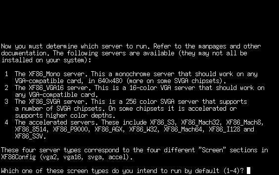 This next question presents several servers that you can use. If you've selected your video card correctly, you can safely hit Enter. That will tell X to use the server that the card specified. Otherwise, you can pick to use the Mono server, VGA16 server, SVGA server, or an accelerated server. The best choice is to use the server that the card specified.