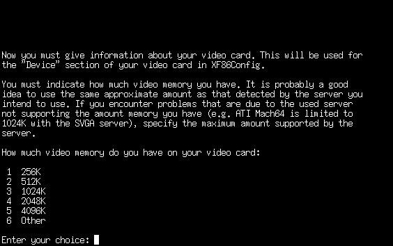 Select the amount of memory that your card has. SuperProbe can be used to give this information as well. If you've got something other than one of the choices, you can select “Other” and enter in a different amount. Make sure that you specify the amount of memory in kilobytes.