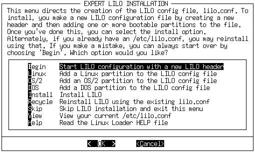 After selecting the installation location, liloconfig will write the configuration file and install LILO. That's it. If you select the “expert” mode you will receive a special menu. This menu allows you to tweak the /etc/lilo.conf file, add other operating systems to your boot menu, and set LILO to pass special kernel parameters at boot time. The expert menu looks like this: